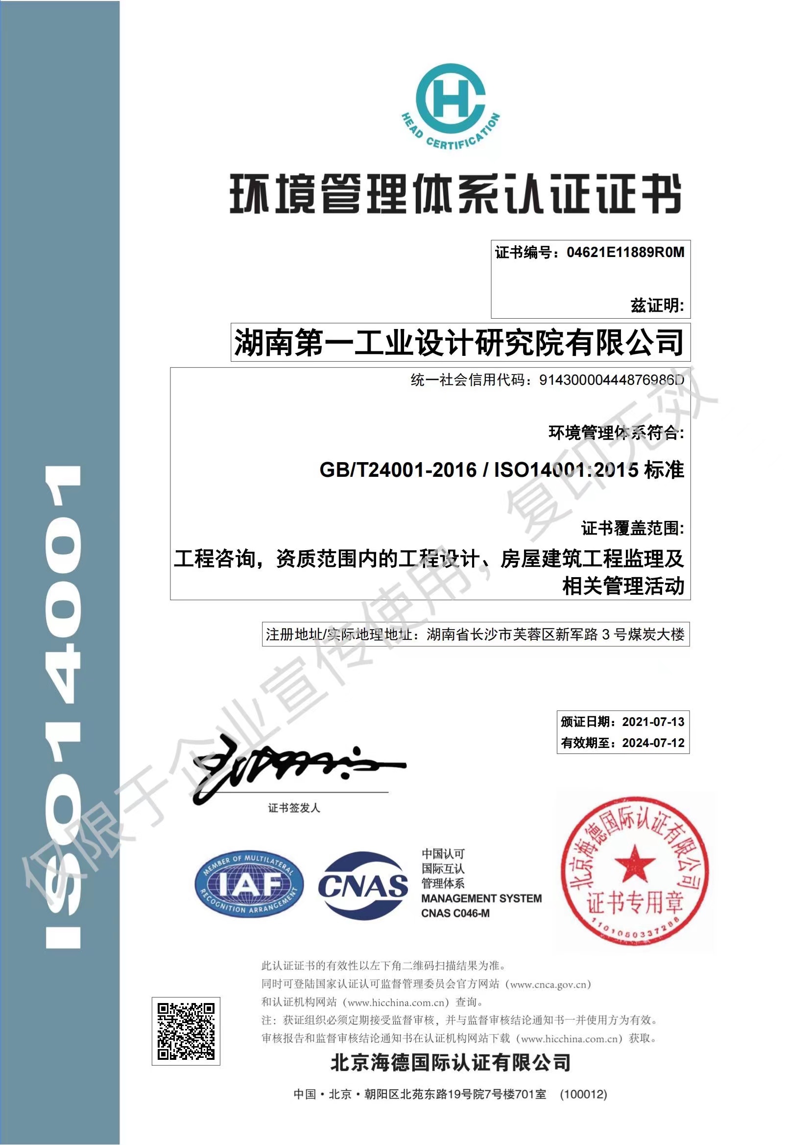 ISO14001環境管理體系認證證書
