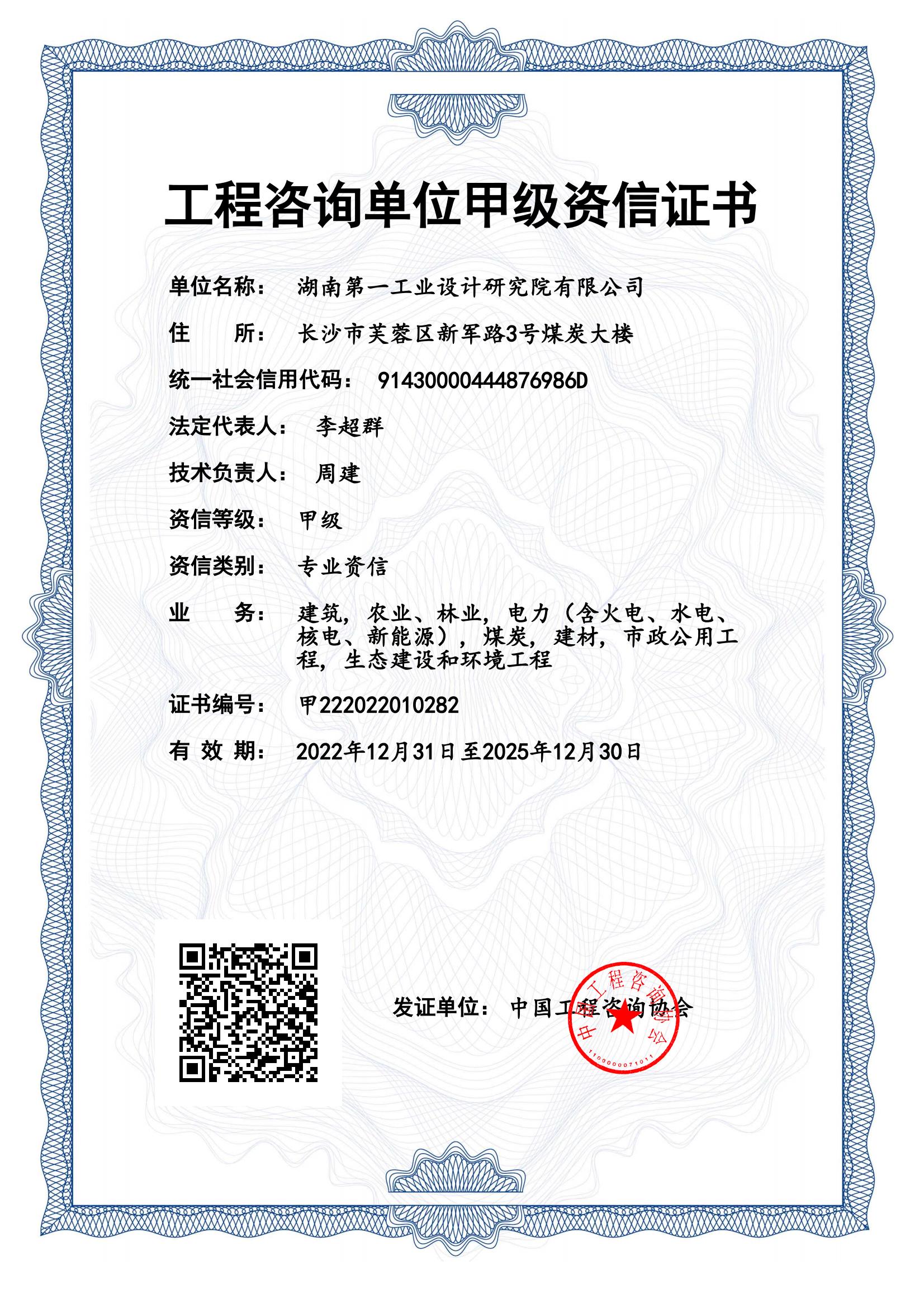 工程咨詢單位甲級資信證書